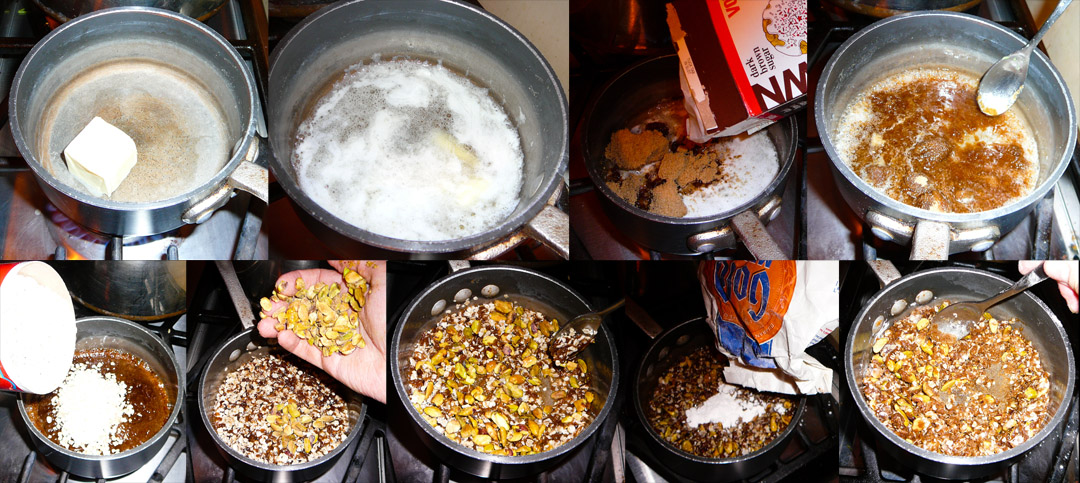 Preheat the oven to 350 degrees F. Create the crust by melting the butter in a small pot on medium heat. Dump in the brown sugar and stil until it becomes like molasses. Dump in the oats and pistachios and allow the butter and sugar to cook into them (approx 1 minutes). Mix in the flour, stir for a moment, and then turn off the heat.