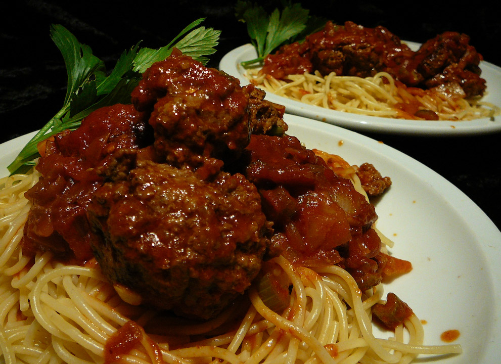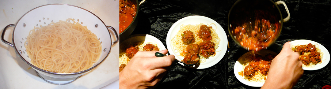 Place a healthy serving of al dente spaghetti on each place, then set a few meat balls on plate and then smother it all with sauce.  Serve with GARLIC (MY BALLS) BREAD and top it off with Parmesan if you are feeling cheesy.Spaghetti meatball al dente scoop