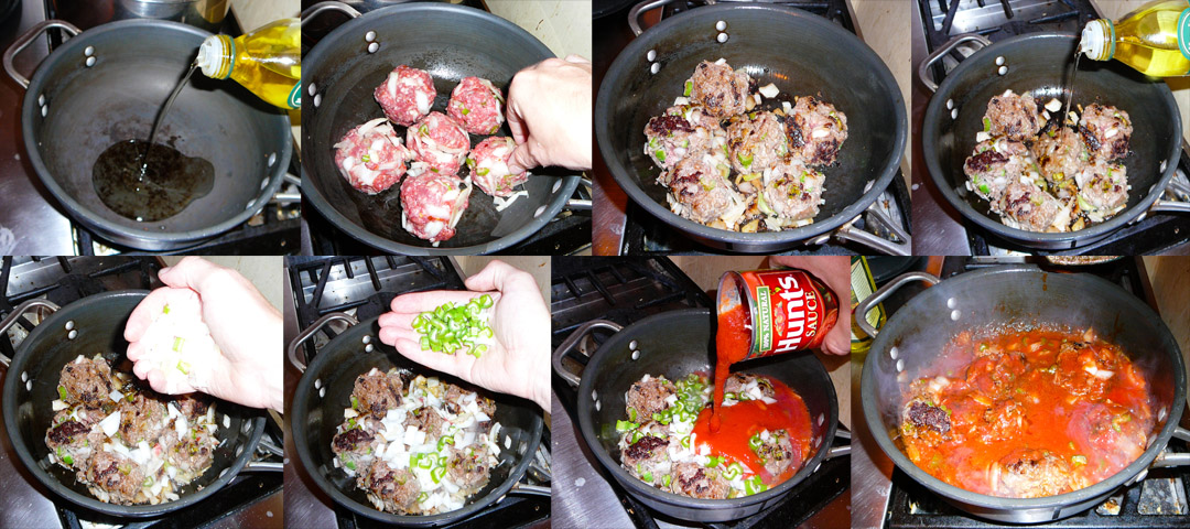 Warm up 1 tablespoon of olive oil in a deep pan on medium heat.  Throw in the meatballs and cook the bottom side until they brown (approx 3 min).  Flip the meatballs and douse the remaining olive over the balls and brown the other side (approx 2 min).  Sauté the remaining onions and celery and cook them down (approx 2 min).  Bring the tomato sauce to a boil on and then lower the heat and simmer until the meatballs cook through (approx 15 min).Spaghetti meatball balls sauce