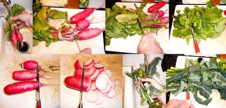 Wash the radishes, chopping the stocks and leaves into smaller pieces. Cut off the ends of the radish and slice into bite-sized rounds. Wash the kale too and cut into smaller pieces.