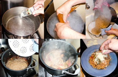 While the spaghetti boils, complete steps 2 & 3. Once al dente, drain and mix in the complete sauce and crown with Parmesan, as you like.