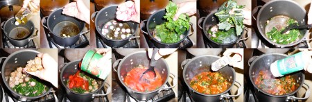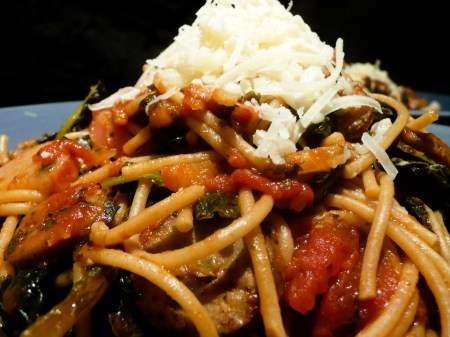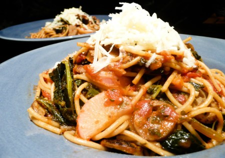 Sauté the garlic and radishes in a stockpot until they soften (approx 5 min). Add the radish leaves and kale and cook until they wilt like spinach (approx 3 min). Push the sautéed veggies to one side and sauté the sausages until they brown (approx 3 min). Pour in the tomato can, using a blunt object to pulverize them even further. Spice the sauce with salt and parsley flakes, slow simmer until the pasta is ready, and then go back to Step 1.