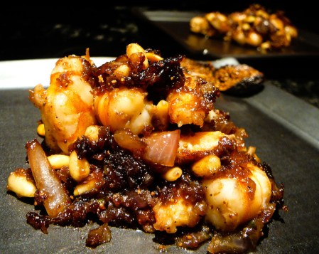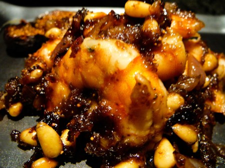 Create the fig sauce by sautÈing the garlic and red onions in olive oil on medium heat (approx 2 min). Throw the pine nuts in and brown (approx 2 min). Scoop in the fig jam and cook until congeals (approx 2 min). Mix the shrimp in and cook until the turn pink, flipping once so they cook evenly (approx 4 min).