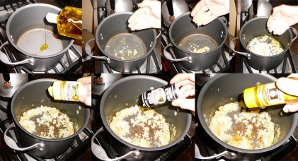 Heat up the remaining olive oil in a stockpot on medium heat. Sauté the garlic and ginger (approx 2 min) before adding the onions that you cook until translucent (approx 6 min), spicing with the remaining salt, black pepper, and curry powder.