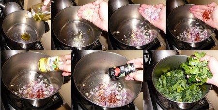 On medium heat, sautÈ the garlic and red onions with olive oil, spicing it with the chili flakes, salt and black pepper (approx 5 min). Add the collard greens and cook in the flavor (approx 3 min).