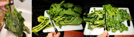 First wash the collard greens, chop off the stocks, and then stack the greens and chop every inch.