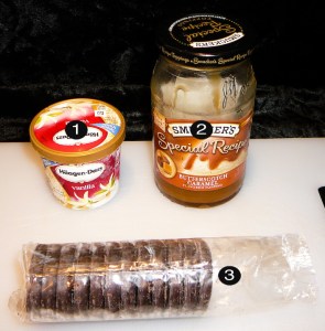 Lay out the Thin Mints. Put a tbsp of vanilla ice cream on each cookie. Heat up the caramel/butterscotch in the microwave or on the stove, and then drizzle a little on half the cookies. Finally press the cookies together like two lovers. Serve them like you mean it!