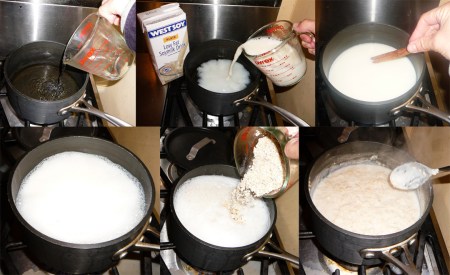 Combine the water, milk, and cinnamon stick and bring to a boil (approx 2 min). Lower to medium heat, mix in the oats, and cook through until the liquid all absorbs (approx 10 min).