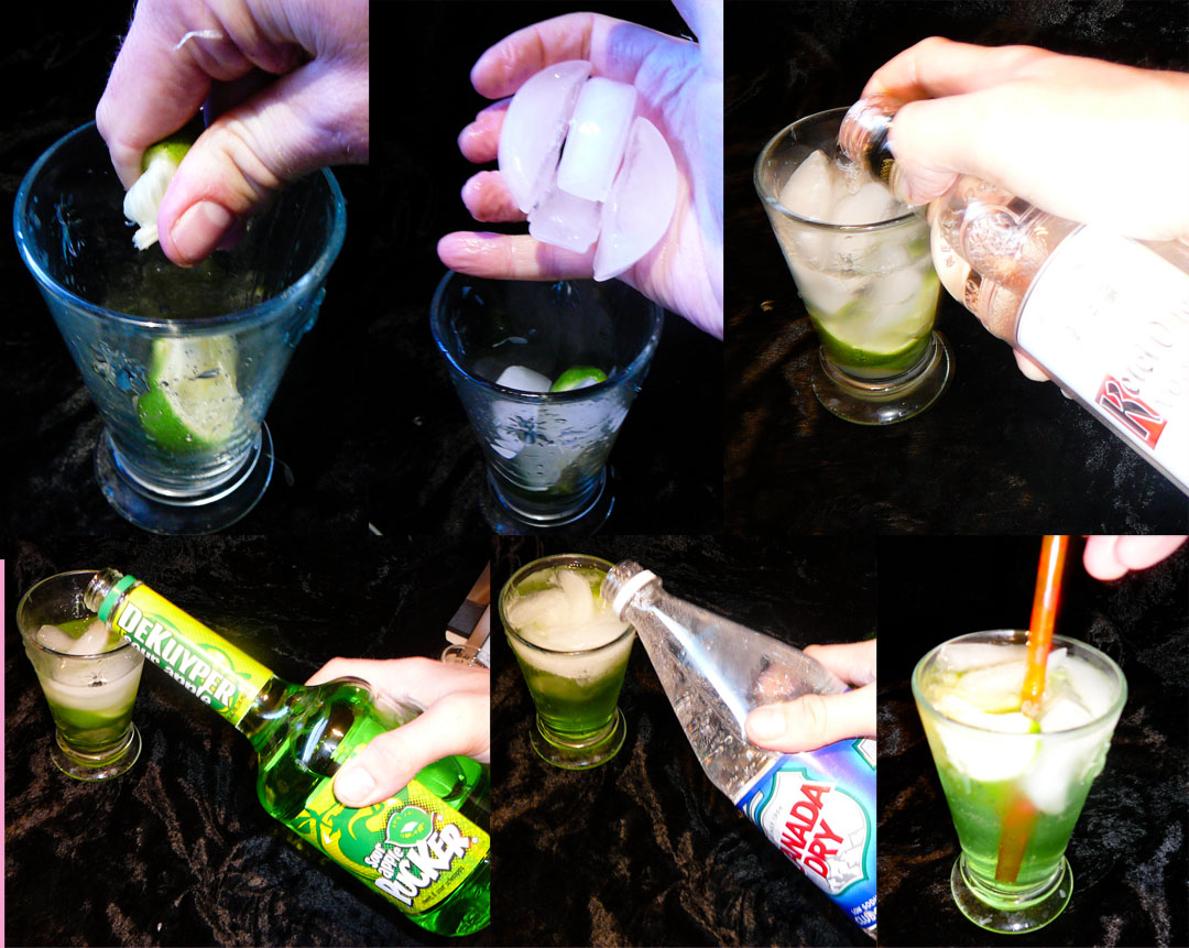 Squeeze ¼ of a lime into the glass, dropping the remains into the glass after. Throw in a large handful of ice, and then pour in 1 shot of vodka and 1 shot of Sour Apple Pucker. Top each glass off with club soda and mix it all together. Drink up before that leprechaun finishes your bevy for you.