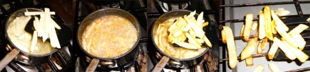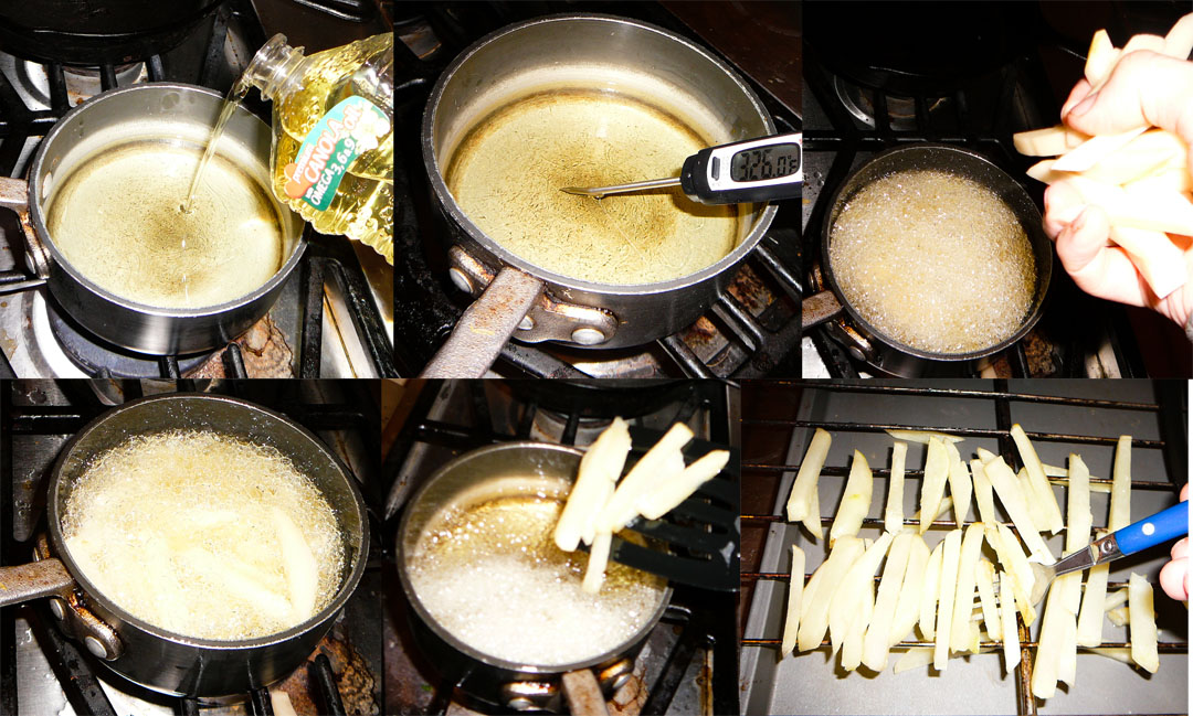 Heat up the oil in a small pot to 325°F/165°C. Throw in the potatoes and fry until the start to harden (approx 2 min). Remove from oil and lay out on something they can drain on (I used an oven rack set over a baking pan). Let them cool down (approx 2 min).