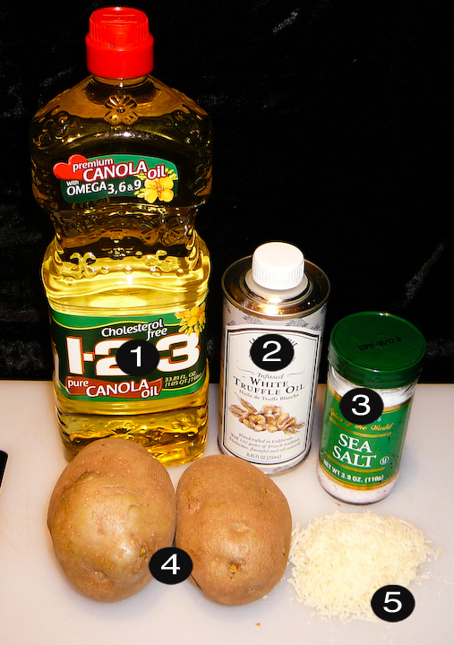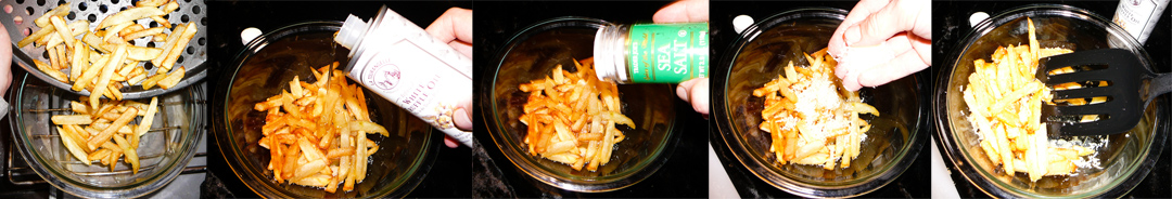 Things are about to get interesting. Dump your crispy fries into a bowl, drizzle the truffle oil, add salt and scatter the Parmesan. Toss the fries in the bowl of totally adulterated flavor and serve immediately.