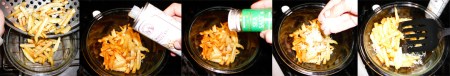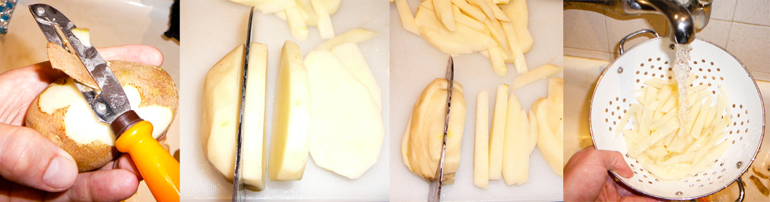 Peel the potatoes, cut fries via thin slicing crosshatch fashion, and then rinse out starch until draining water is clear.