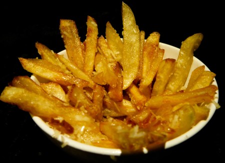 To attain this level of awesome, Belgium-style double-fry for that extra crispy taste. Throw the fries back in and cook until they turn golden brown (approx 2 min). Allow the fries to cool and drain once more (approx 2 min).