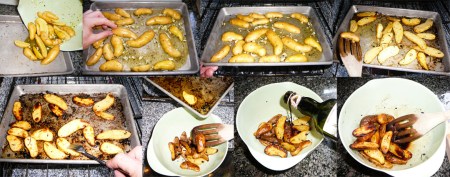 Spread the marinated fingerlings on a small baking pan, laying the flat ends down. Bake the potatoes until they brown and can be forked easily with a fork (approx 25min), flipping halfway through cooking. Toss the roasted potatoes in the balsamic vinegar and serve.