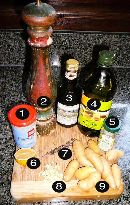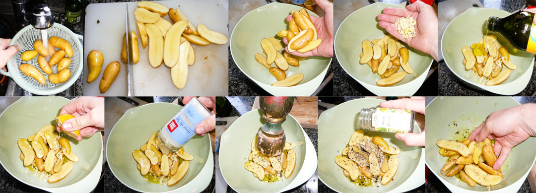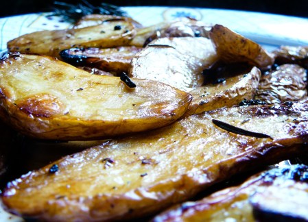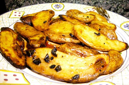 Preheat the oven to 450°F/232°C. Wash the taters thoroughly and then split them. Toss them with the garlic, olive oil, lemon juice, salt, pepper, thyme, and rosemary.