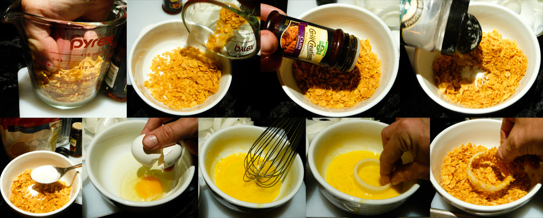 Preheat the oven to 375 degrees F. First crush the cornflakes without pulverizing them. Combine together with Cajun seasoning, salt and sugar. In a separate bowl, beat an egg thoroughly. Dip the separated onion rings in the egg and then the cornflake breading.