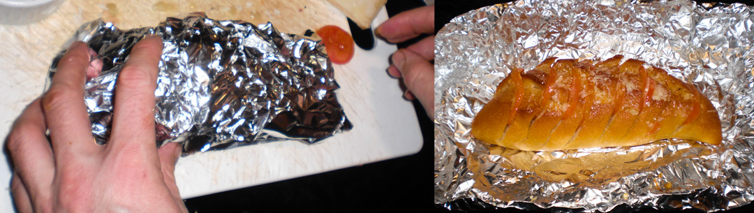 Preheat oven to 350 degrees F. Wrap the bread up in tinfoil and throw in the oven for 15-20 minutes. The top of the bread will be brown, the tomatoes soft and the cheese melty on top. Serve with pasta of your choice and accept you are probably getting laid tonight.