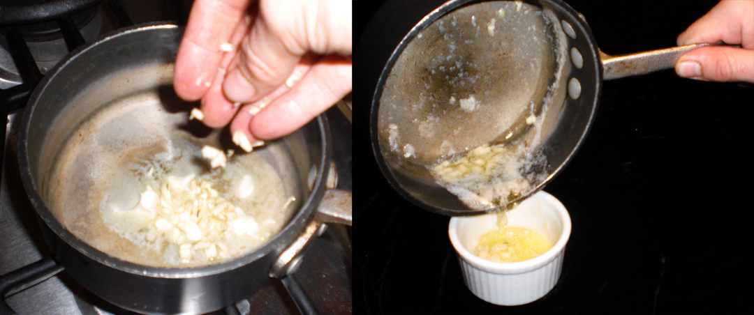 Melt the butter in a saucepan and cook in the garlic until it goes white (approx. 1 minute). Pour the garlic butter into a container and put in the fridge to cool and harden slightly (approx 15-20 minutes).