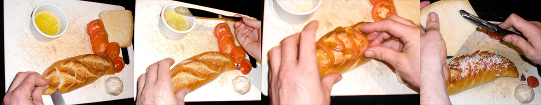 Cut slices into the baguette leaving some of the bottom crust attached. Spread a small amount of garlic butter between each slice. Place a slice of tomato between the bread slits. Grate parmesan a top the baguette.