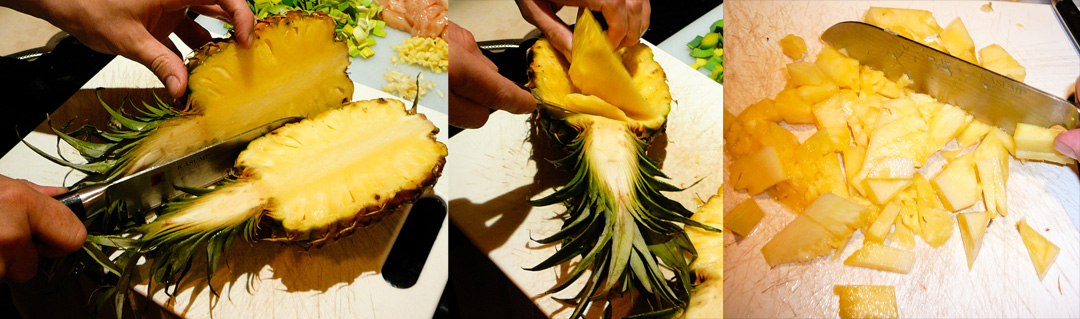 Split the pineapple length-wise.  Use a pairing knife to cut out the meat from the middle, but leave enough around the edges so it holds it’s form.  Chop the meat up into bite-sized pieces.  Set aside.
