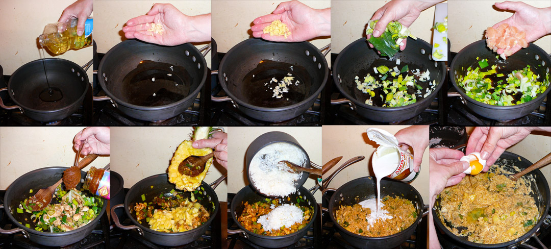 Heat the oil in a large deep pan or wok on high heat.  Toss the garlic, ginger and leeks and cook down (approx 2 minutes).  Add the curry paste and pineapple and stir in the flavor (approx 1 minute).  Mix in the rice thoroughly, stir in the coconut milk and finally crack the egg over and mix it in.
