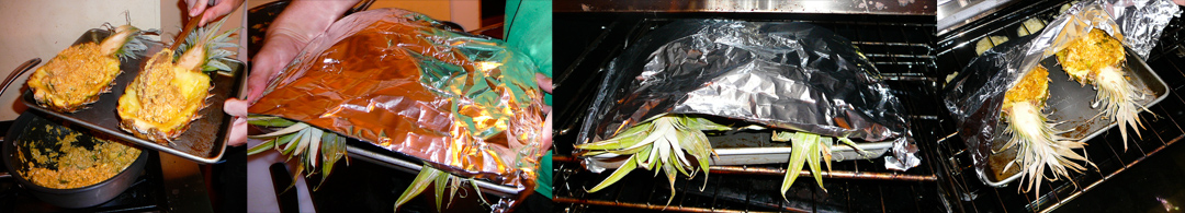 Scoop the rice into the hollow pineapple halves until the overflow like a mound above the fruit’s lip.  Cover the stuffed pineapples with tinfoil and bake through in the oven (approx 20 minutes).  Serve up on a plate with your favorite ENTRÉE.