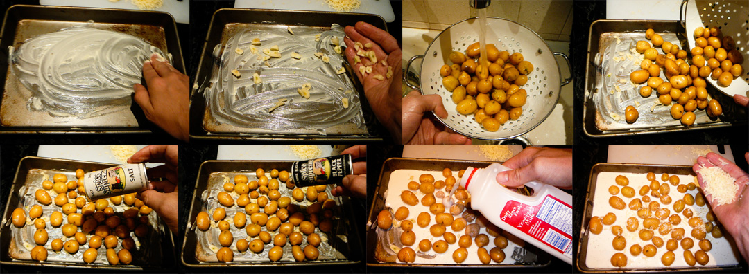 Preheat the oven to 450°F/230°C. Rub the butter into a small baking pan and scatter the garlic slices around. Wash the potatoes and spread them evenly out in the pan and give 2 dashes of salt and pepper. Finally pour in the milk and cheese.