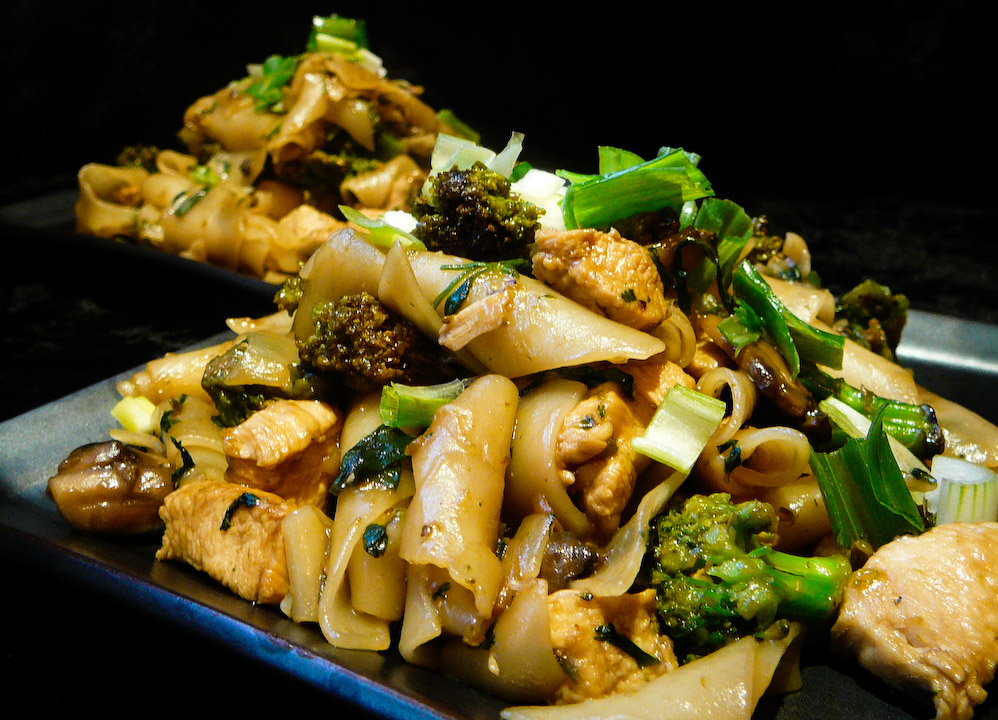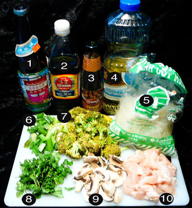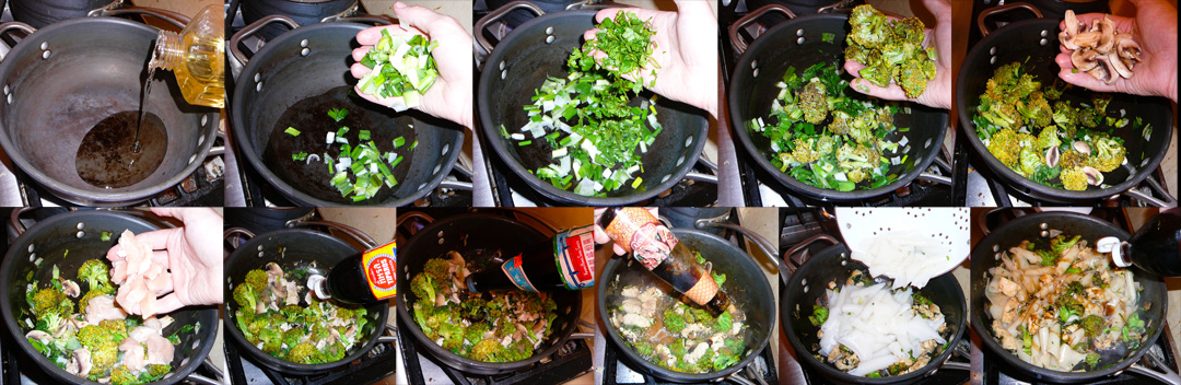 Warm up the vegetable oil in a deep pan or wok on high heat. Add the green onions, cilantro, broccoli, mushrooms and chicken and cook until veggies soften and chicken cooks through (approx 5 min). Add the Kwong Hung Seng, fish and oyster sauces and let flavor set (approx 2 min). Dump in the noodles and stir-fry it all together until the noodles have soaked up the flavor (approx 2 min). Add extra sauce if you so desire.
