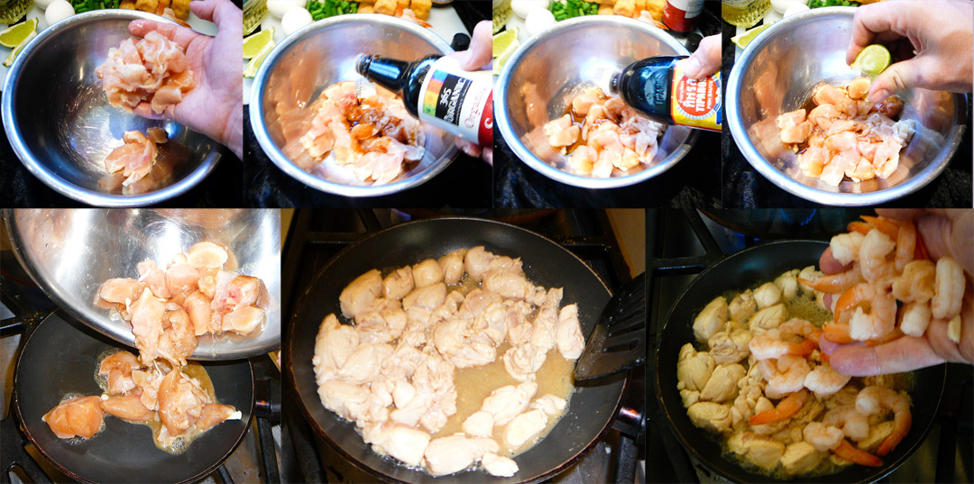 Marinate the raw chicken with the soy sauce, fish sauce and limejuice (approx 15 min). Cook the chicken in a pan until they brown (approx 3 min). Add the shrimp and cook it all together (approx 2).