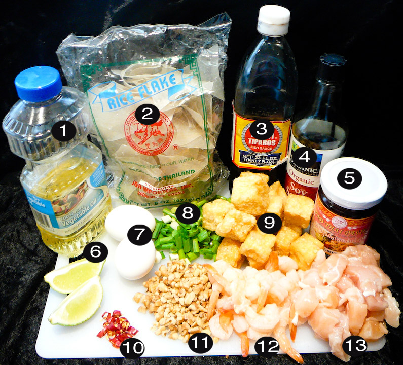 Bring a pot of water to a boil, turn the heat low and cook the rice noodles al dente (approx 4 min) and drain. Heat up the oil in deep pan or wok. Add the noodles and mix in the pad Thai sauce thoroughly. Cook in the chicken, shrimp, fried tofu and green onions.