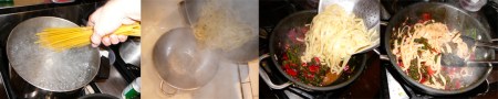 Boil the linguine al dente (approx 10 min). Drain and toss with in the pan with the veggies.