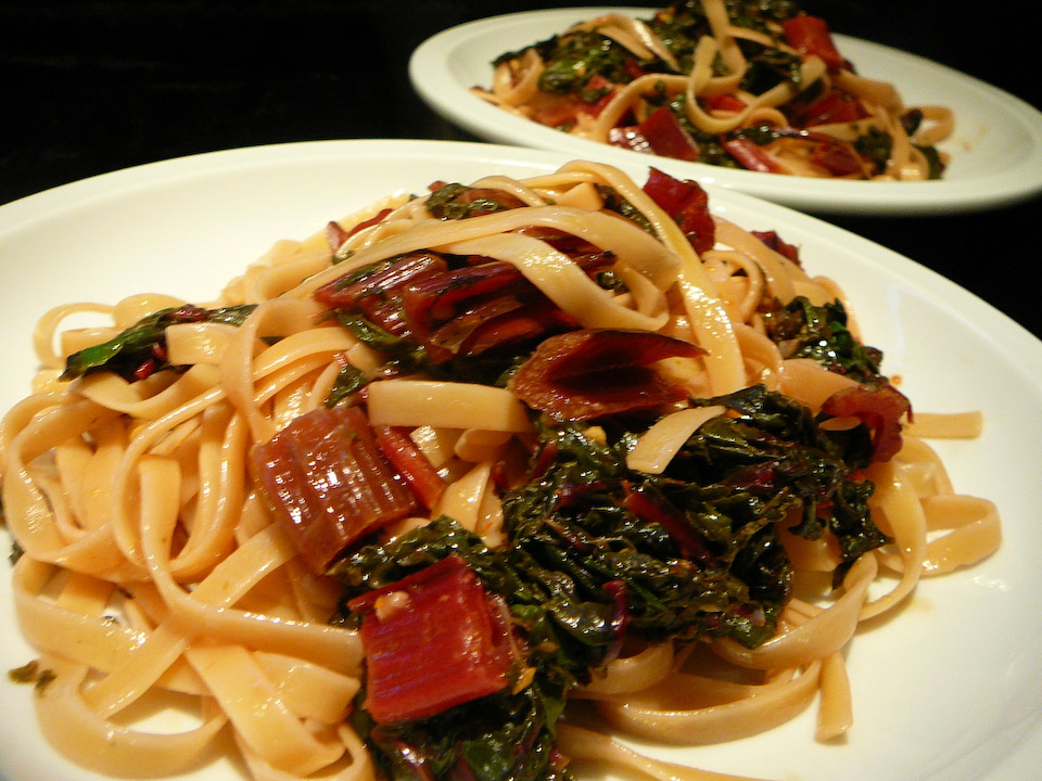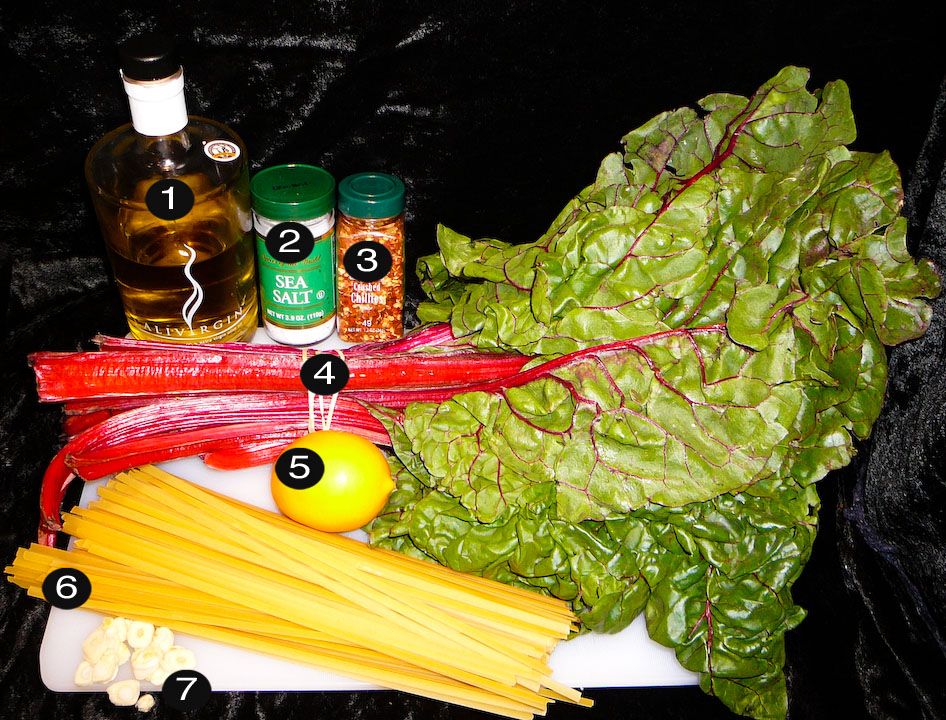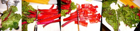 Wash the rainbow chard. Cut the stalks into bite-sized pieces. Cut the chard leaves into 1 inch strips. Meanwhile, bring a large pot of water to boil pasta.