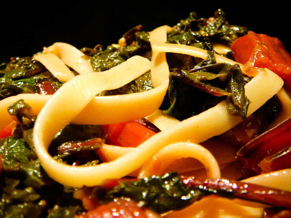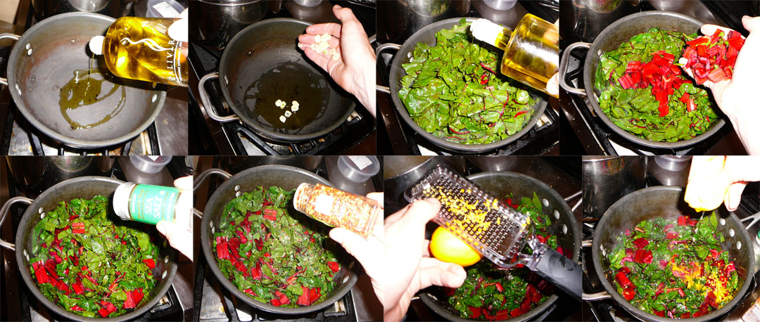 Warm up 1 tbsp of olive oil in a deep pan on medium heat. Saute the garlic slices until they start to brown (approx 30 sec). Toss in the chard leaf strips, drizzle with remaining olive oil, and throw the chopped chard stalks. Salt and red chili flake it all. Zest the lemon and then squeeze in all the juice. Turn the heat low and cook slowly.