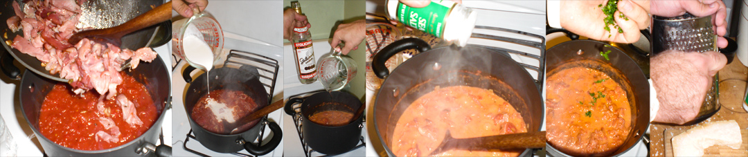 Dump in the prosciutto and garlic into the tomatoes, stir in, and cook for 1 minute. Add the heavy cream, stir, and cook for 1 minute. Pour in the vodka, stir, and cook two minutes. Add the desired amount of salt and mix in the parsley. Grate some Parmesan.