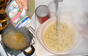 Boil a big pot full of water on high heat (while you wait, move onto next steps). Pour in the contents of the dry penne, stirring occasional and cook al dente. Once done, run under cold water to wash out excess starch.