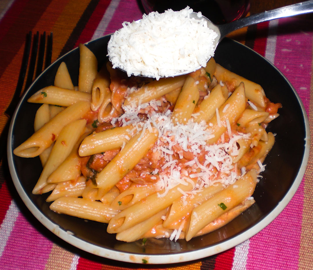 Toss the cooked penne into the sauce and mix thoroughly, heating it all through. Throw the completed product on plates, crown with Parmesan and serve with some garlic bread and tons of vino.