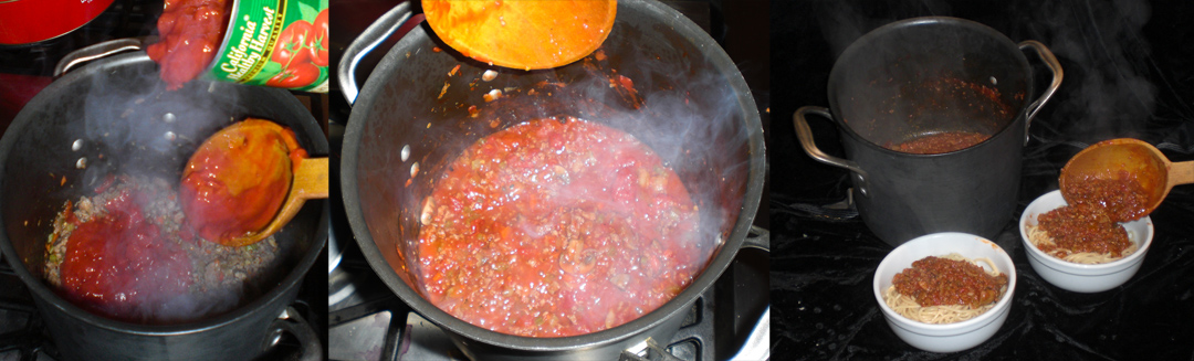Pour the crushed tomatoes into the stockpot with the veggies and meat and mix together thoroughly.  Bring it all to a boil, then turn the heat down to its lowest setting and cook for 1-2 hours, occasionally stirring or adding water when sauce becomes too thick.  If desired, stir in the heavy cream a few minutes before you are ready to eat and allow the sauce to thicken.  Now serve the sauce over spaghetti with garlic bread and a bottle or red wine.  Sing falsetto as you present the food if possible.