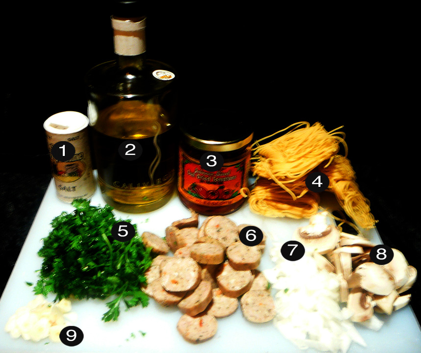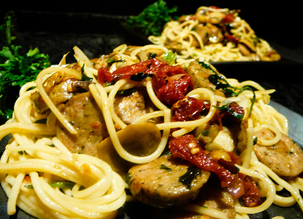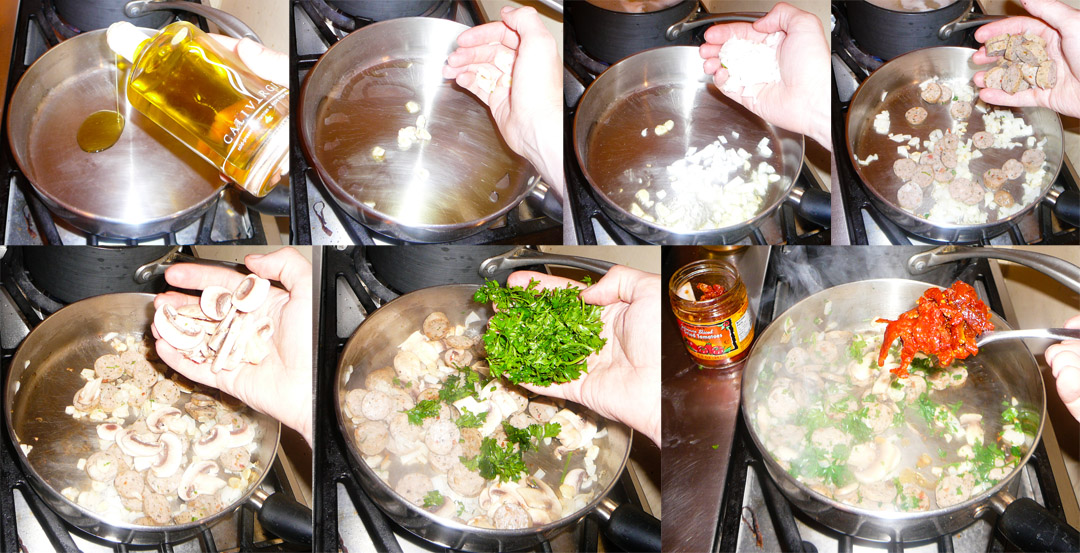 First set a pot of water to boil.  Sauté the garlic and onion in olive oil.  Add the sausage, mushrooms, parsley and sun-dried tomatoes and let it all cook on ultra-low heat.