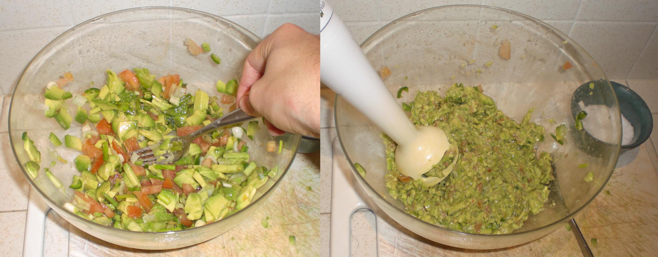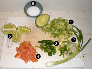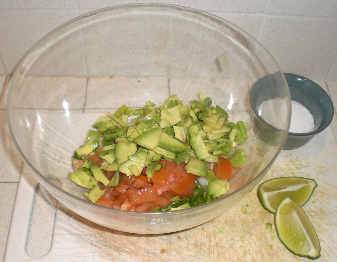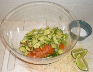 Throw the chunks of avocado, green onion, jalapeno and tomato into a bowl and mix like a champ. Squeeze the lime and salt as desired (not much more than a teaspoon).