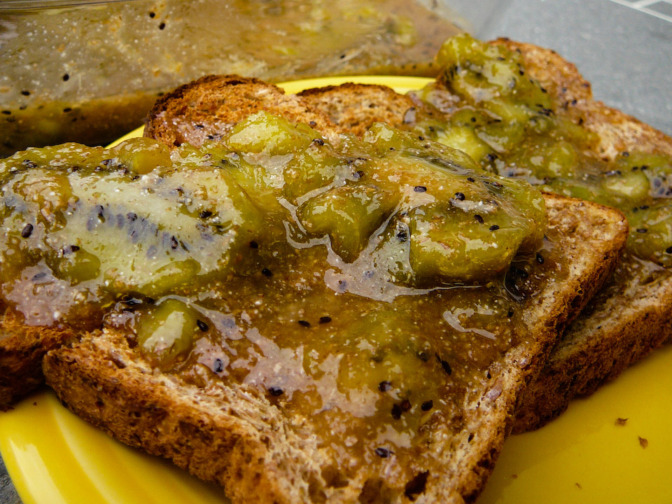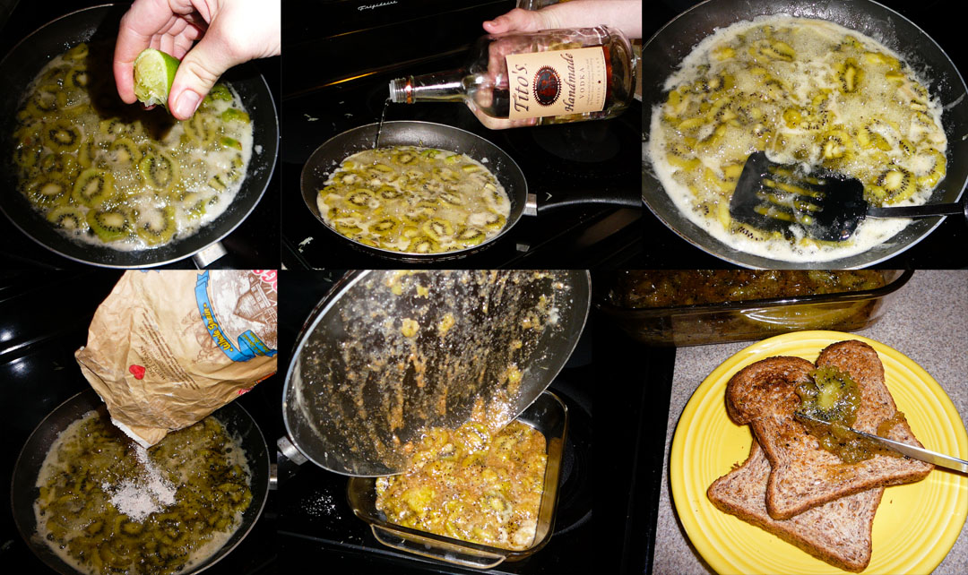 So I admit freely that my knowledge of New Zealand is limited to the Lord of the Rings, Flight of the Conchords, and a family friend who renounced his Kiwi citizenship. None of this was going to help the fact that I brazenly invited a cute New Zealand girl I met randomly at a bowling alley bar over for dinner. She believed me when drunkenly I claimed that New Zealand cuisine had inspired my culinary palette. So the gauntlet was thrown down for me to WOW this hopefully kinky kiwi. All my research has turned up was in detail reports about the oppression of the Mauri people, which didn’t strike me as light dinner conversation. So I just bought a bag of kiwi fruit and winged it. After great debate with myself, and with timing running out before she showed up, I decided to make a jam of sorts. I served it with bread, Brie cheese and a New Zealand wine. This winning combination led to a winning combination of positions in the bedroom, invented by the same people that brought us bungee jumping. After that night I vowed never to never confuse Kiwi and Aussie girls again. They hate that.
