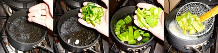 Bring a small pot of water to a boil. Throw in the garlic, jalapeños, and cactus and blanche (approx 5-10 min).