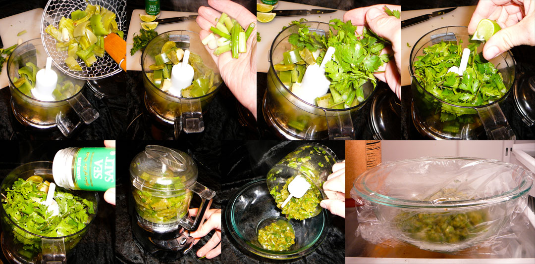 Remove the blanched veggies from the water and throw into a food processor or blender. Combine with green onions, cilantro, limejuice, and sea salt. Blend it all up, throw into a bowl, and refrigerate (approx 1 hr).