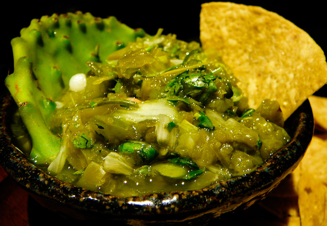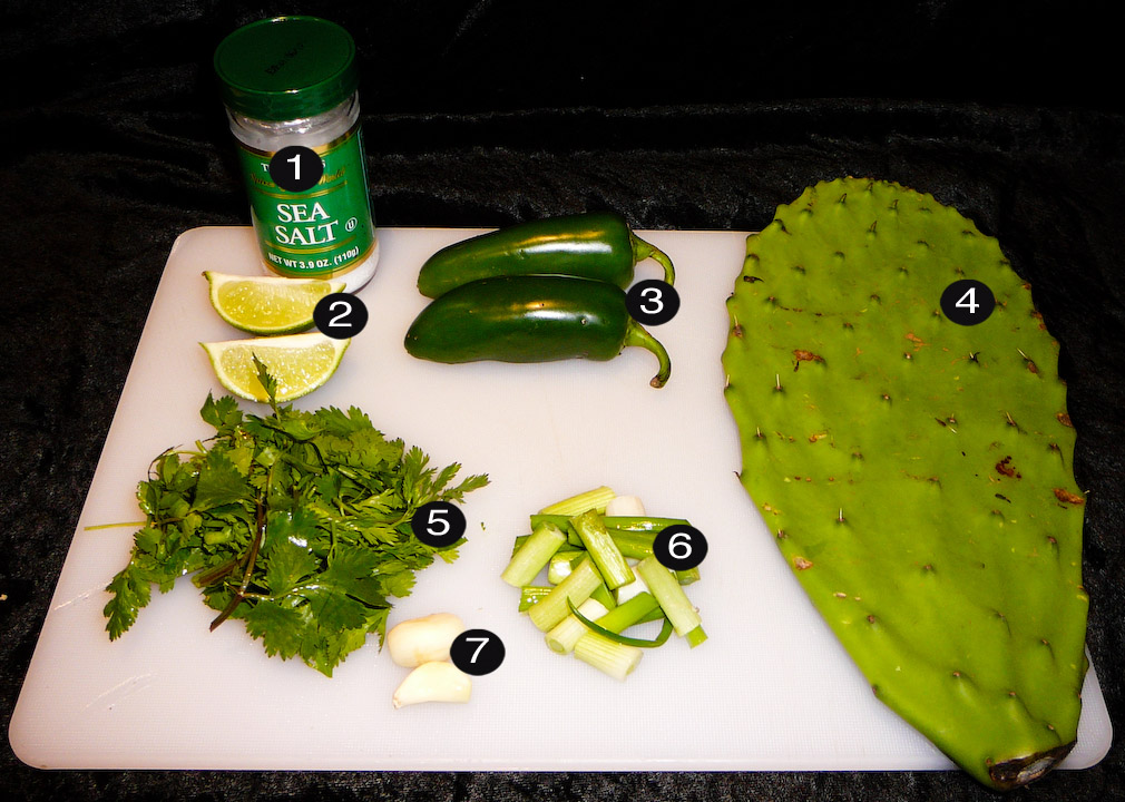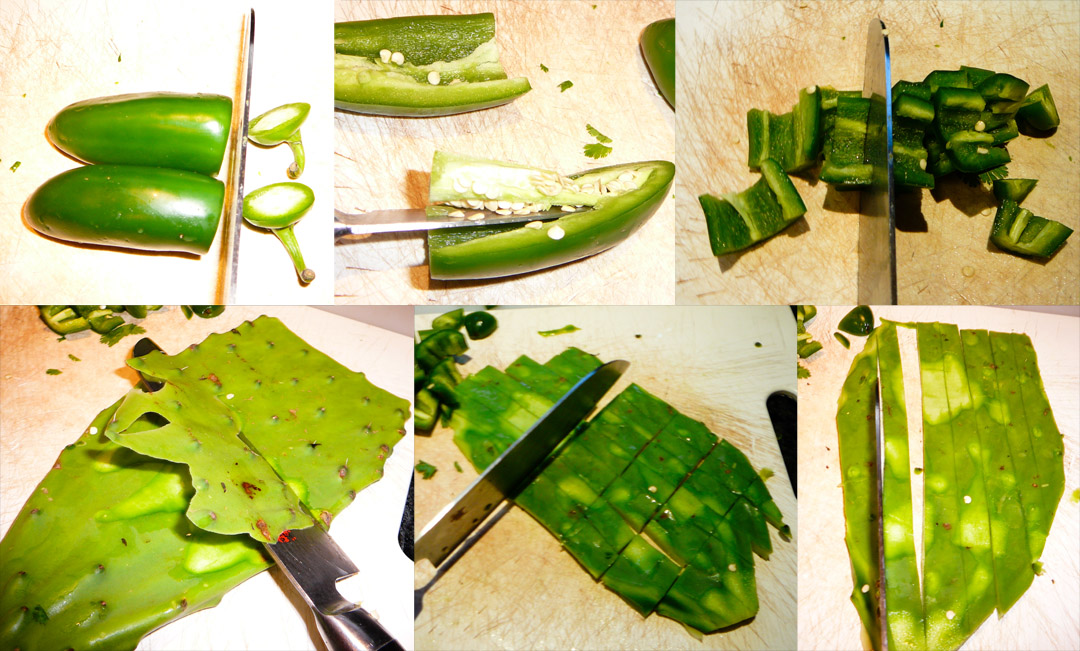 Cut the stems off the jalapeños, cut out the seeds and veins, and chop coarsely. Shave off the cactus barbs and chop coarsely.