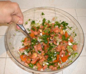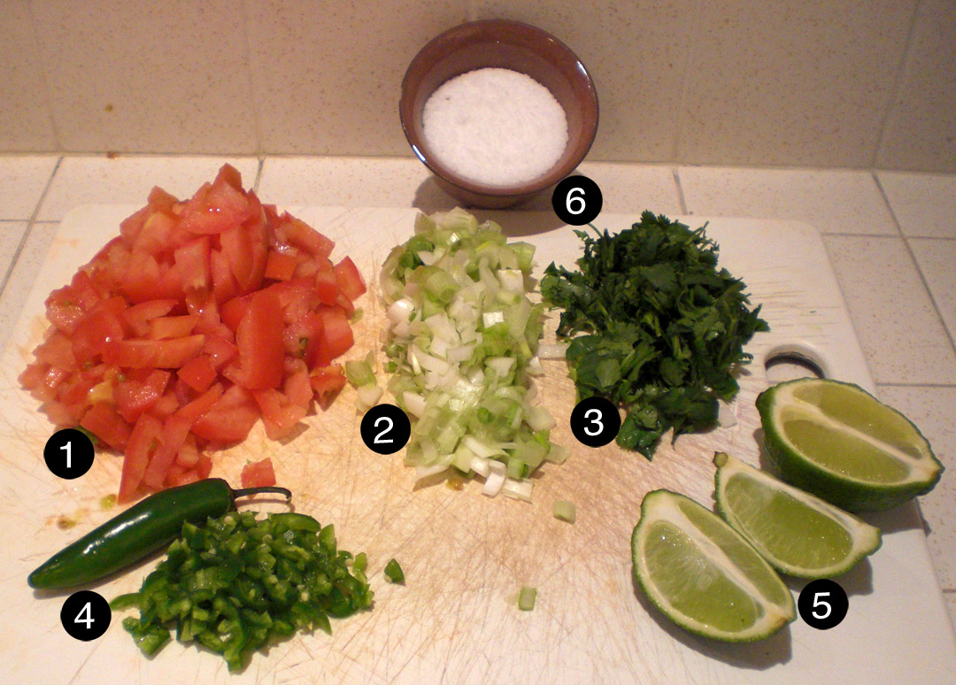 Throw the chunks of tomato, green onion, cilantro and jalapeno into a bowl, squeeze the lime and throw in salt to taste.