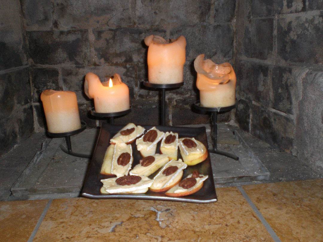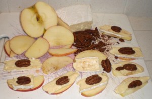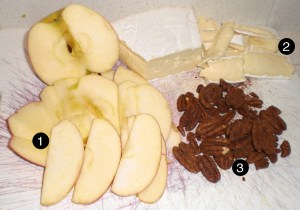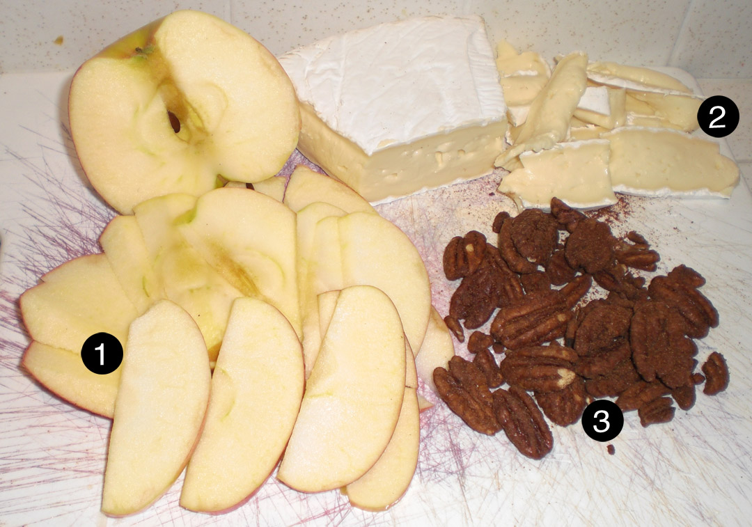 Take an apple slice and place a brie slice above and then a candied walnut on top. Repeat until you have enough.