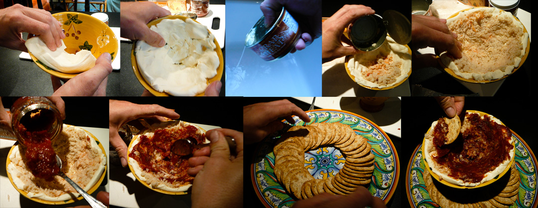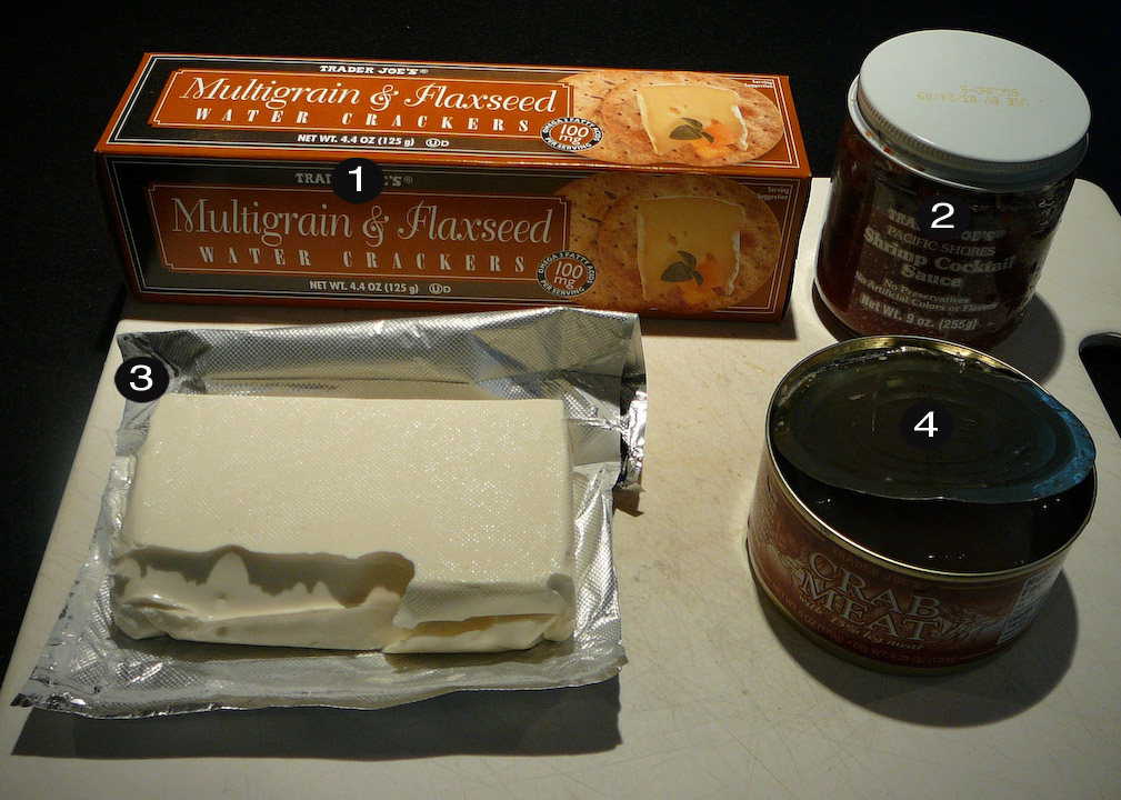 Spread cream cheese around the edges of a deep bowl. Drain the crab meat and then rub it evenly into the cream cheese. Scoop the cocktail sauce and rub it evenly into the crab. Create a wheel of crackers and place the dip bowl in the middle. Drag the crackers along the edge of the bowl and scoop yourself up some good times.