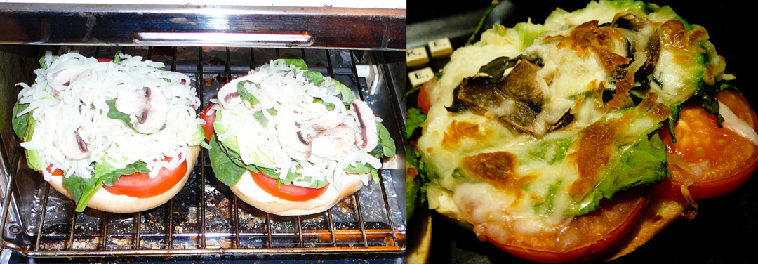Slice the bagel in half. On each side, spread a thin layer of butter, place tomatoes, spinach, avocado, layer of mozzarella, basil leaves, and mushrooms. Pat in all down with your hands so everything bakes in place.
