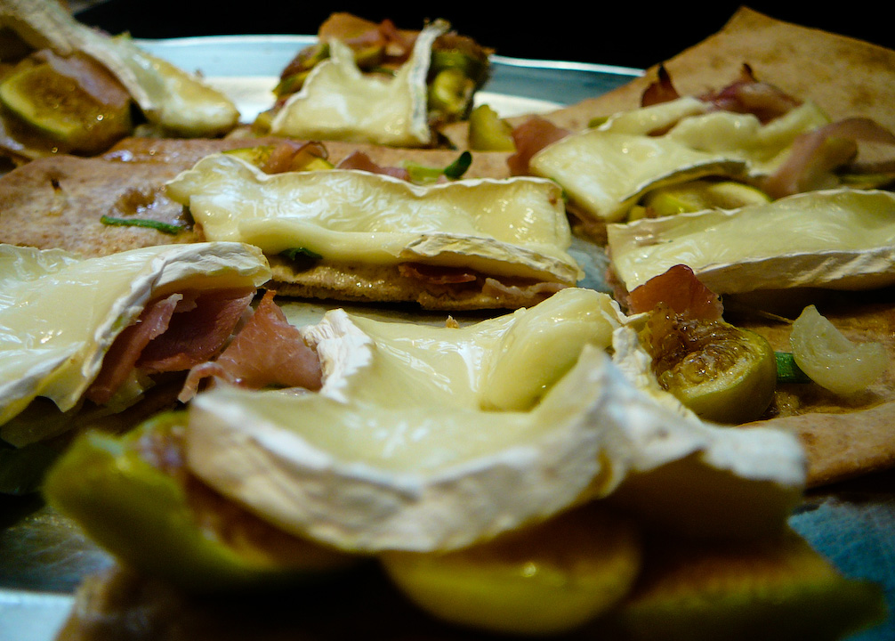 Preheat oven to 350°F/175°C. Rub olive oil into the flatbread and scatter the green onion, figs, prosciutto, and Brie slices.