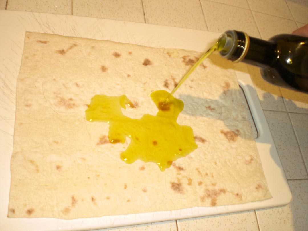 Preheat oven to 350 degrees.  Drizzle olive oil over the lavash and spread it around evenly.