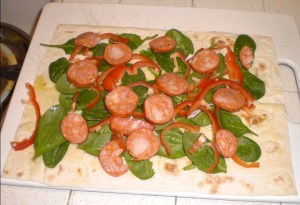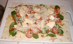 Place the veggies, meat and cheese over the lavash.  It’s best to do veggies first, meat second and cheese last to hold your ingredient down.  Like a pizza crust, make sure to leave some room around the edges so it’s easy to hold onto.